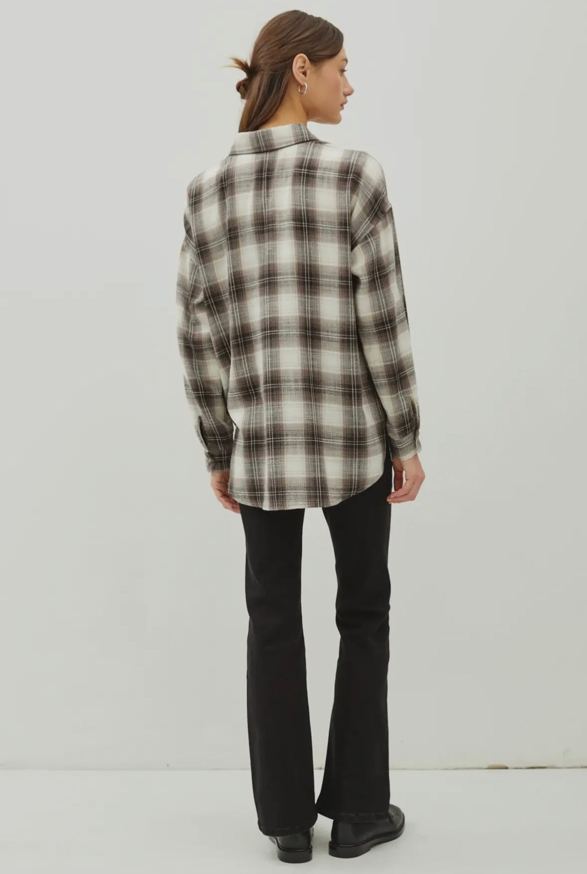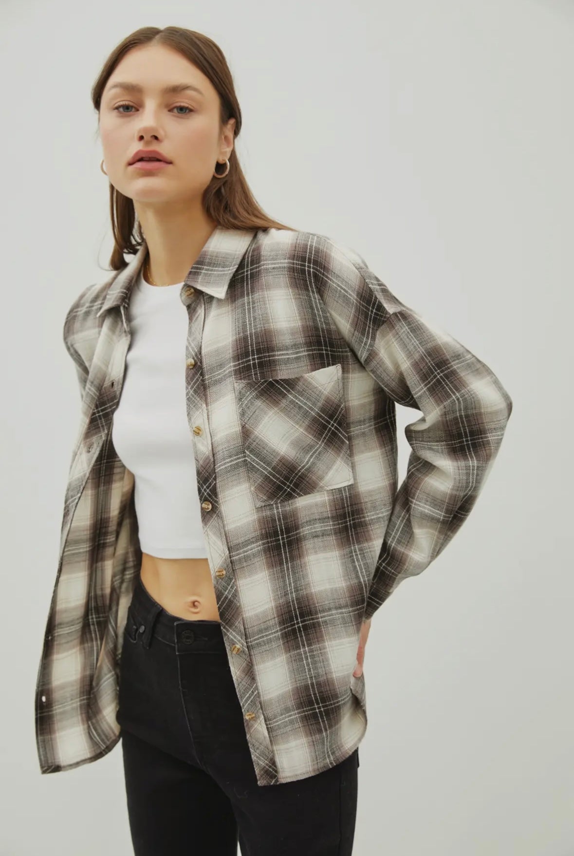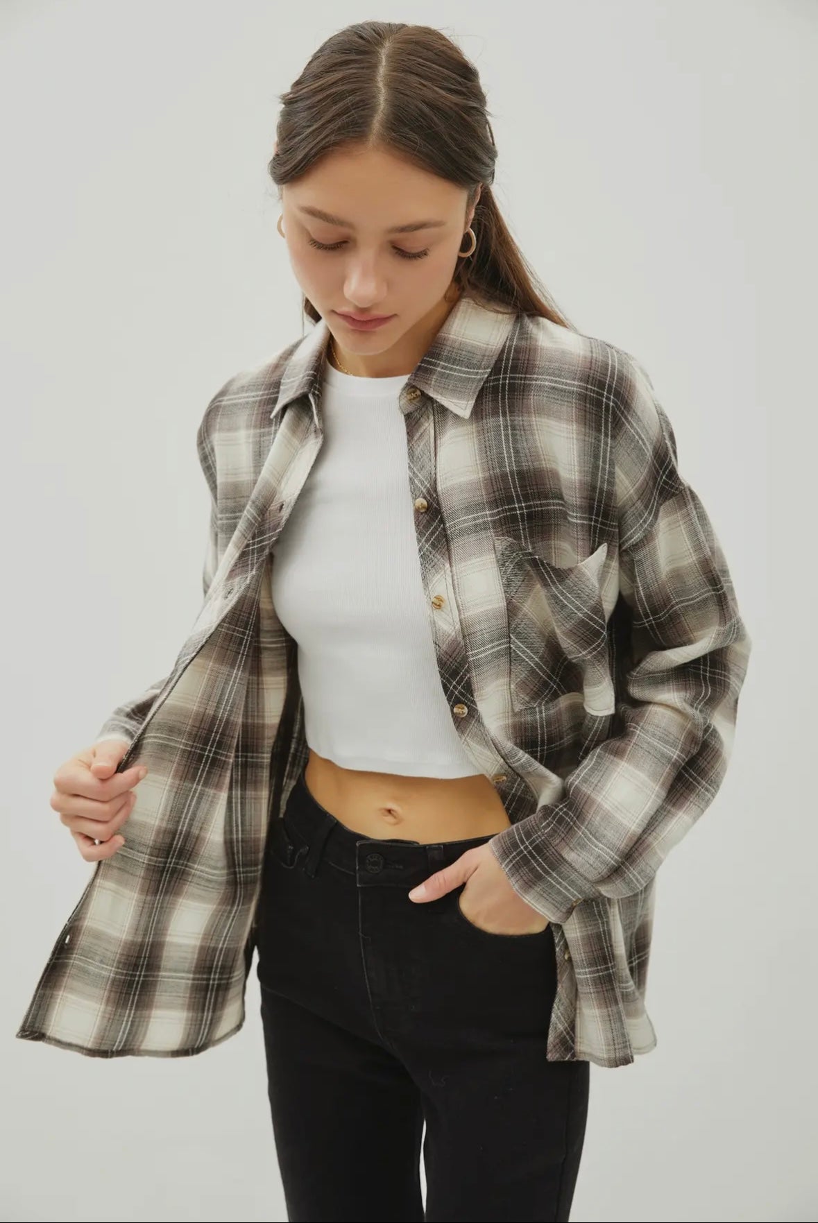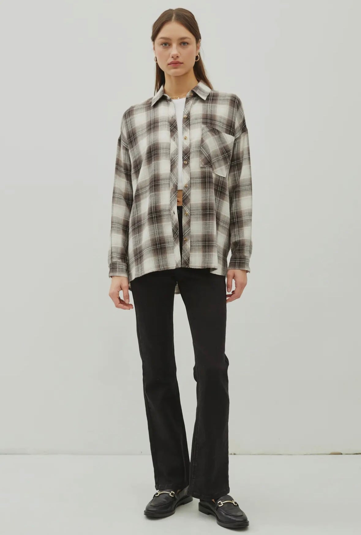 Wrap yourself in cozy style with our oversized charcoal and chocolate brown plaid button-up! A classic design, this top is both comfortable and stylish. The dark colors and soft fabric will keep you warm and fashionable all day long.