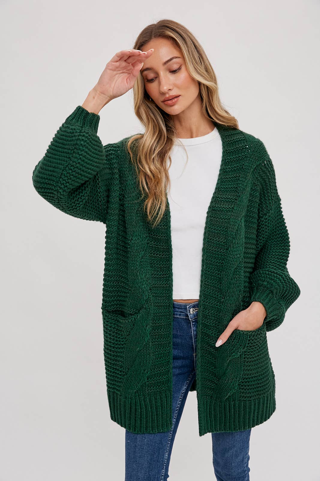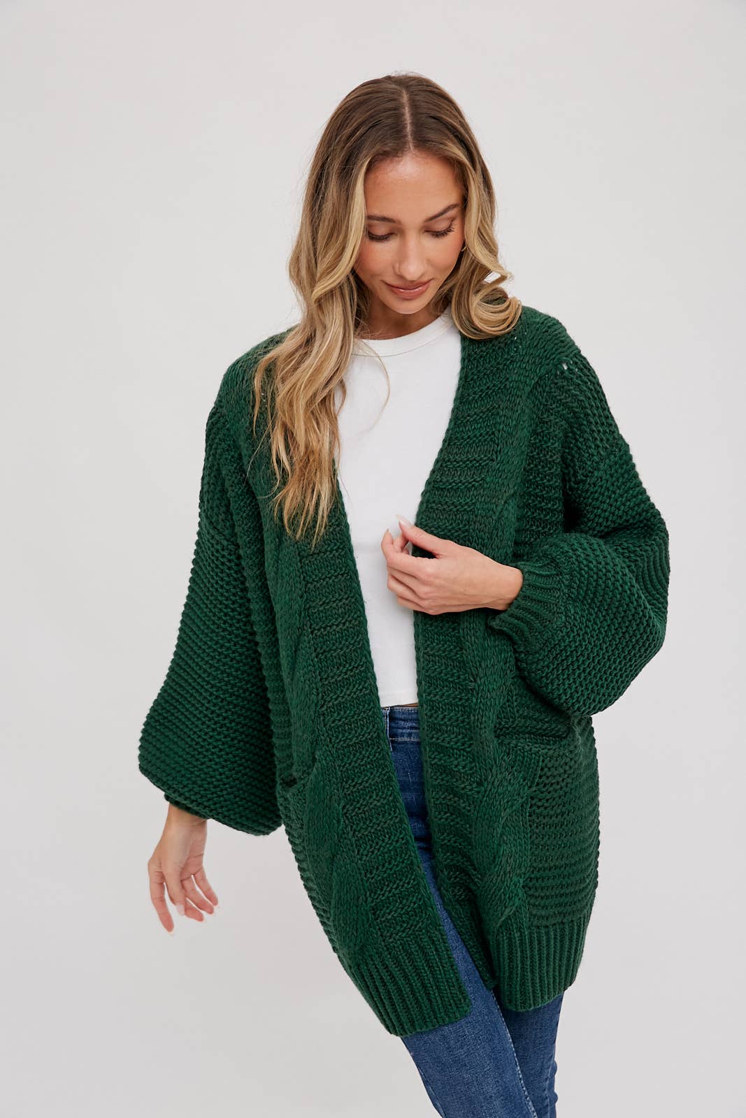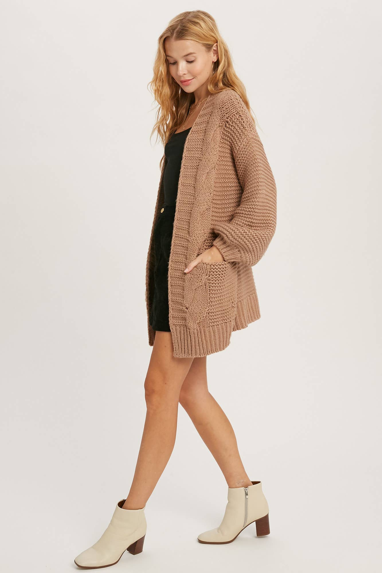 A chunky cable knit cardigan featuring an open front, front patch pockets, long lantern sleeves, and a relaxed fit.