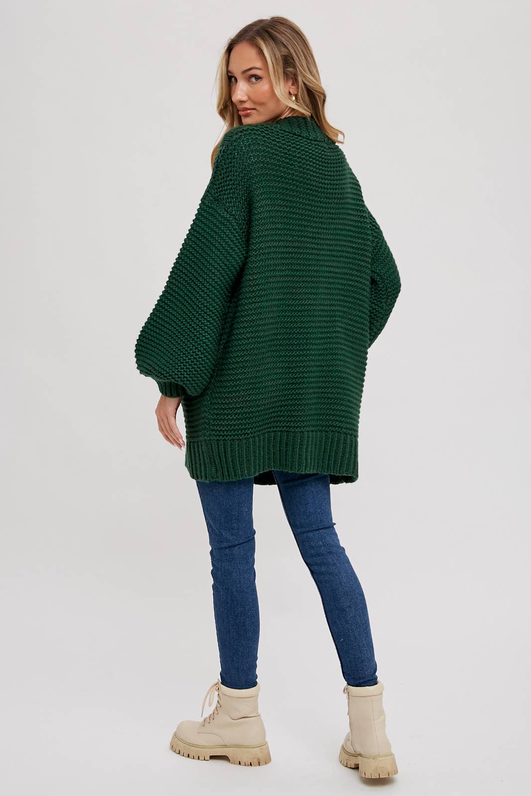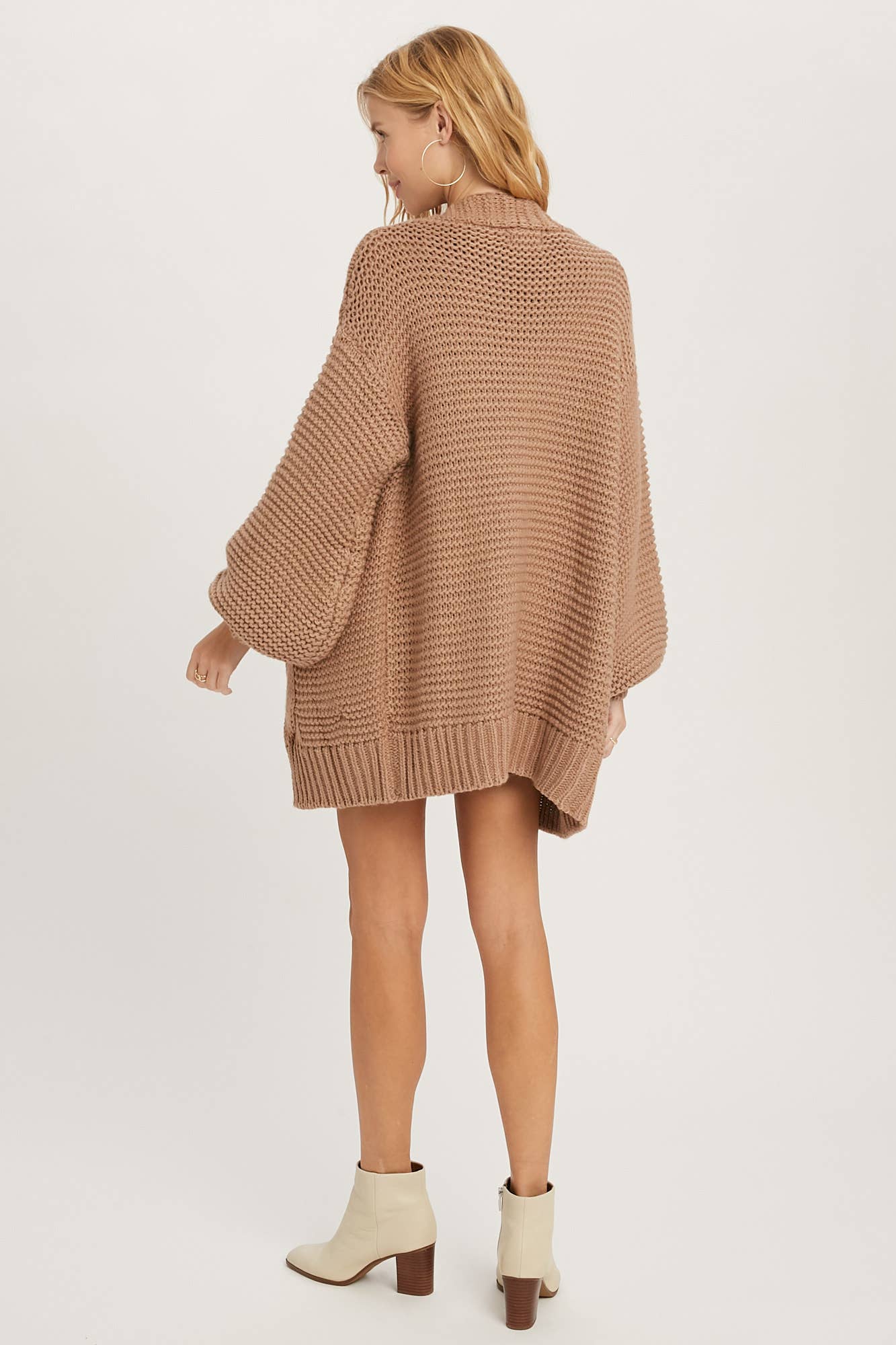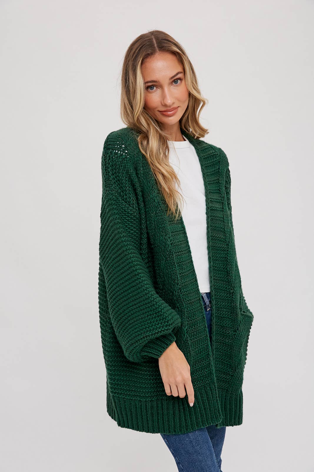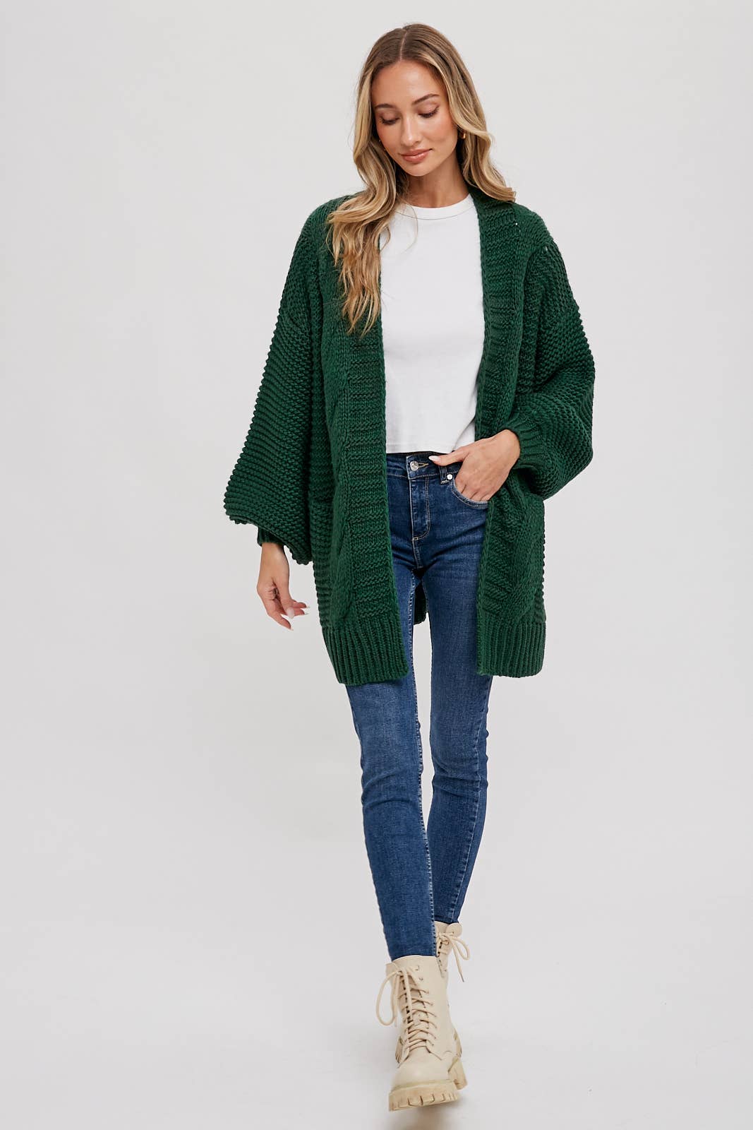 A chunky cable knit cardigan featuring an open front, front patch pockets, long lantern sleeves, and a relaxed fit.