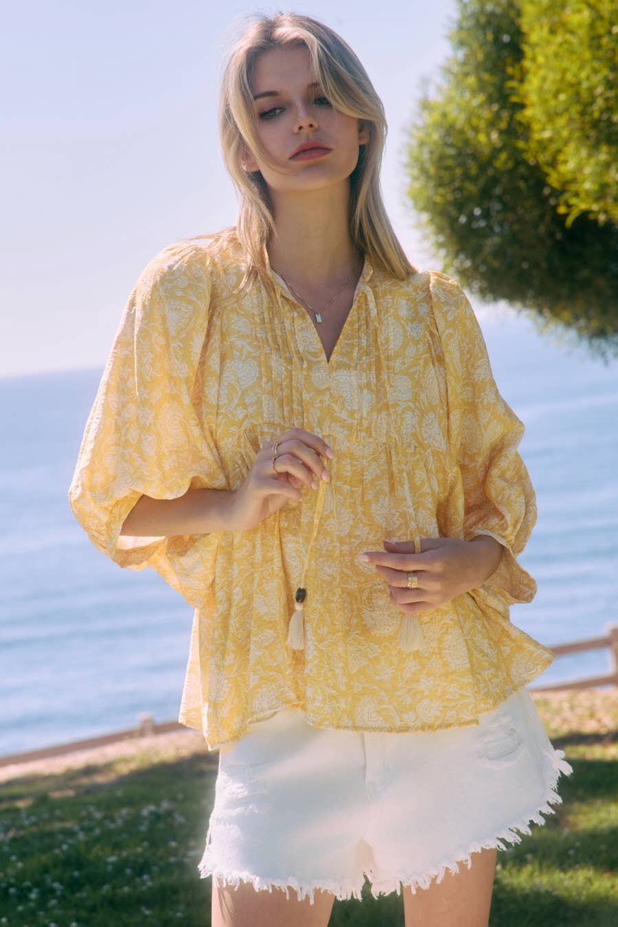Brighten your wardrobe with this cheerful peasant top featuring a charming gathered split neckline adorned with tassel ties. The voluminous 3/4 puff sleeves add a touch of whimsy and movement to your everyday look. Crafted from a soft rayon and nylon blend, this lemon-yellow and white-printed beauty falls below the waist for the perfect relaxed fit.